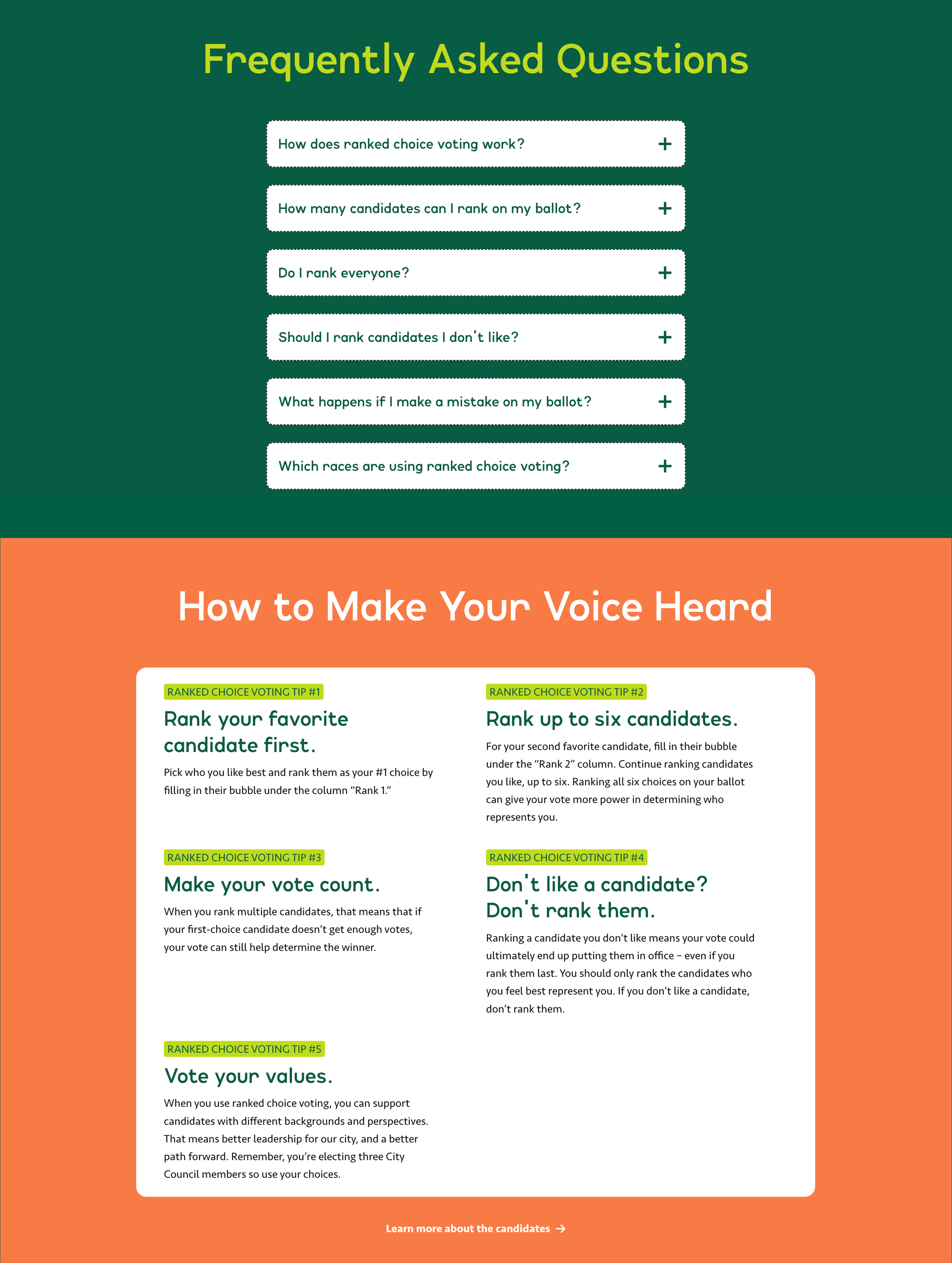 The organizations wanted a voter guide that felt authentic, bold, and trustworthy while rejecting conservatism and fear. It was important that the design was community-oriented and focused on beloved local landmarks.